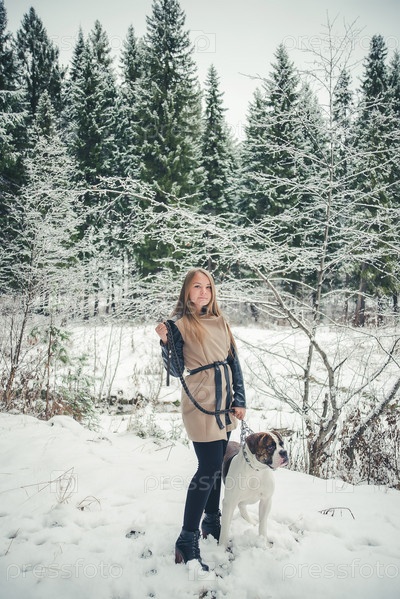 Девушка с собакой на фоне зимнего леса