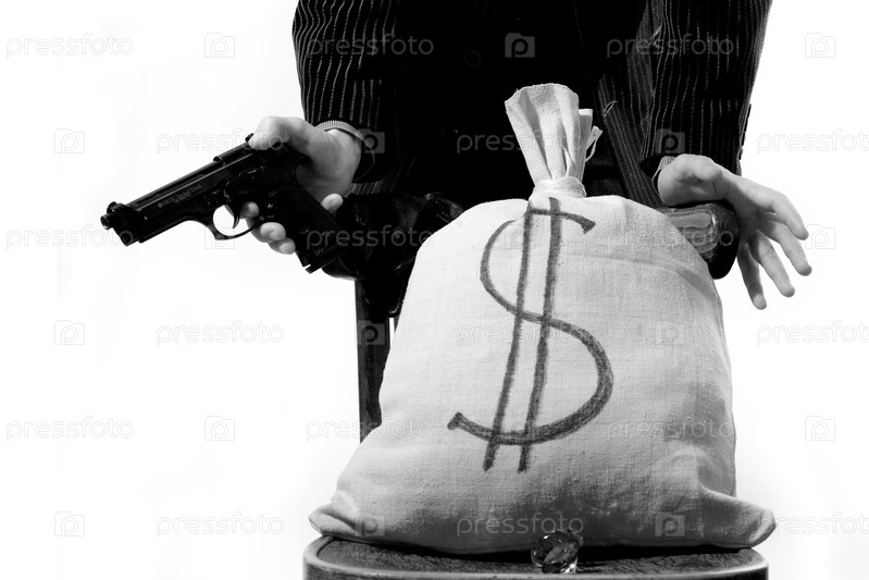 Мешок денег и мужчина с пистолетом, стоящий рядом