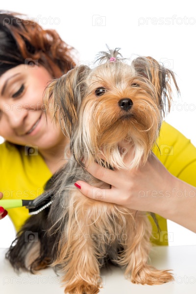 Молодая девушка расчесывает питомца