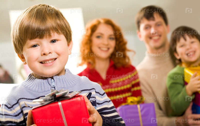 Портрет счастливого мальчика с настоящим, смотрящего в камеру на фоне своих родителей и брата