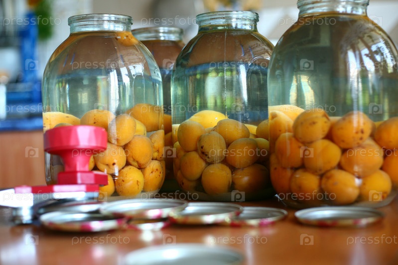 Банки со сладким компотом из абрикосов