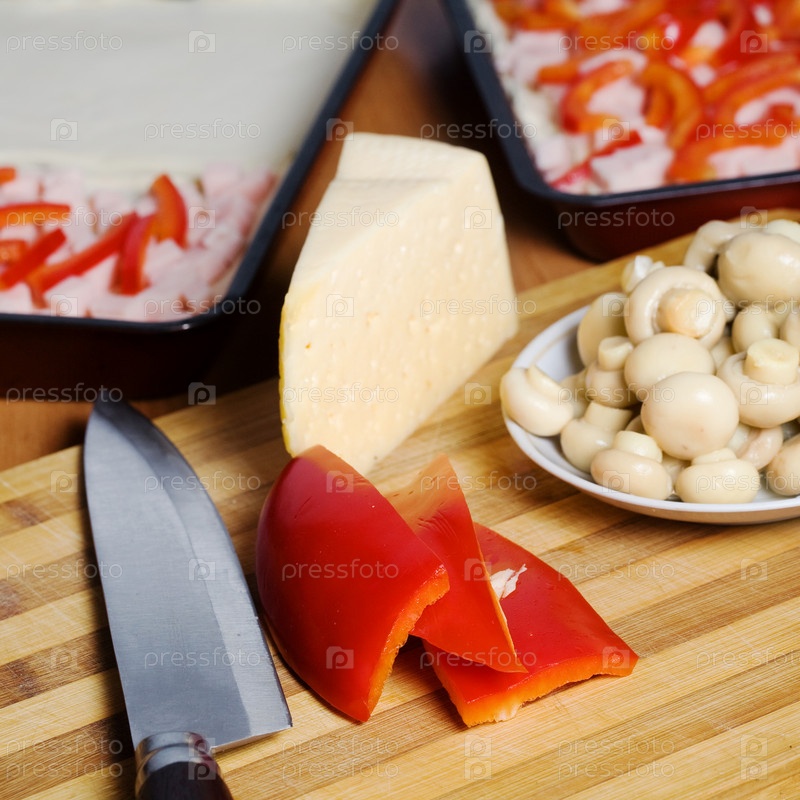 Грибы, перец, сыр и ножи на кухне