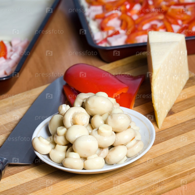 Грибы, перец, сыр и ножи на столе