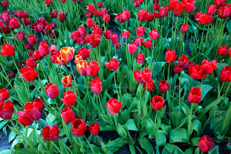Поле красивых красных тюльпанов