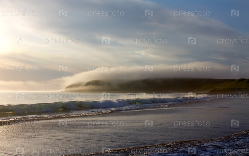 Солнечное побережье, пляж и туман, сползающий с гор
