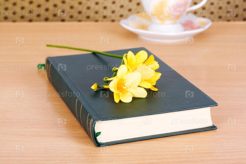 Книга и желтый цветок на столе