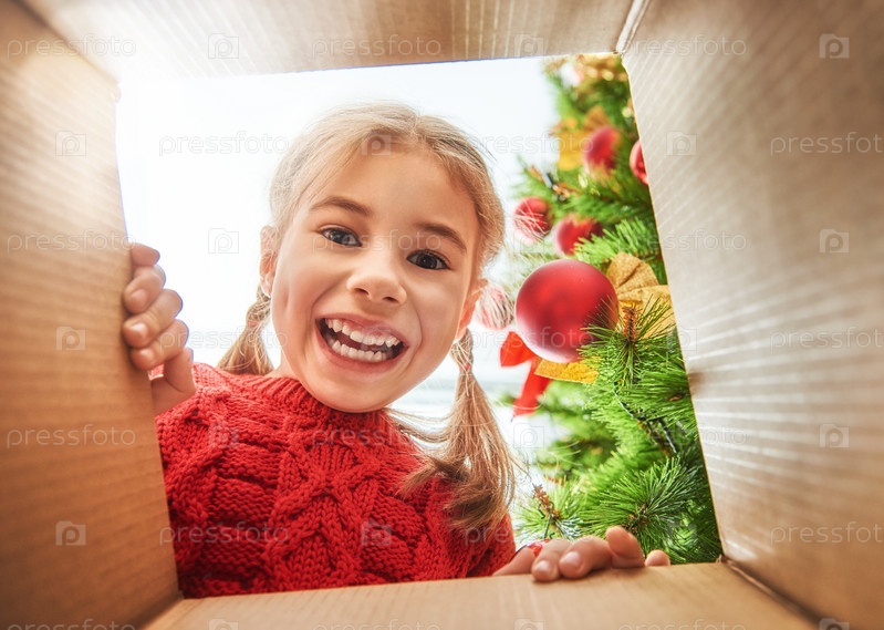 Девочка открывает рождественский подарок