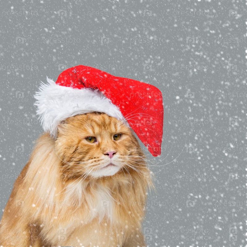 Большая рыжая кошка в рождественской шляпе
