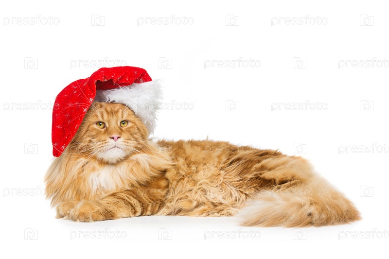 Большая рыжая кошка в рождественской шляпе