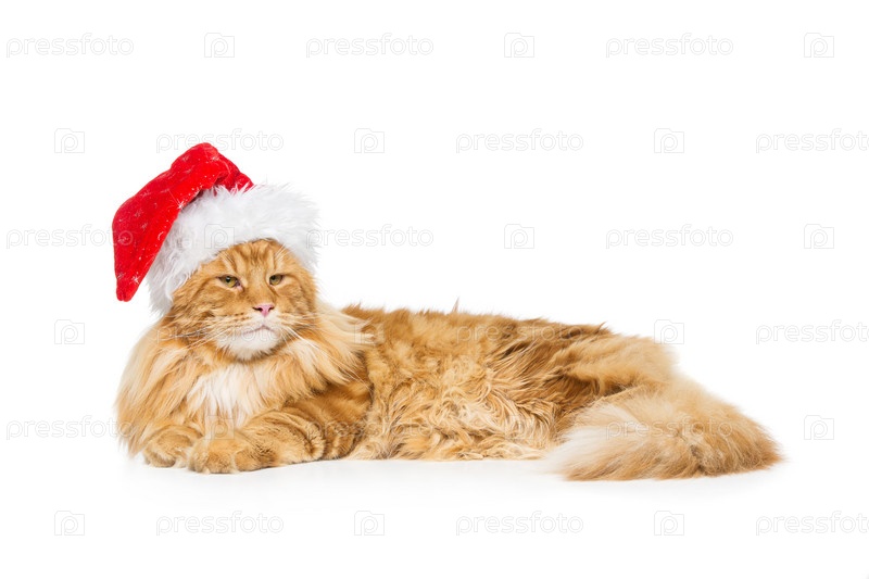 Большая рыжая кошка в рождественской шляпе