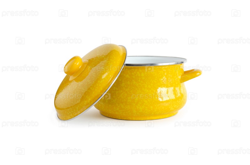 Новая желтая открытая кастрюля с крышкой на белом фоне. Обтравочный контур включен
