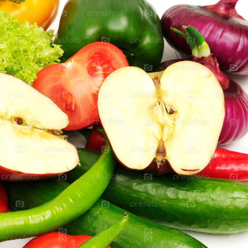 Свежие фрукты и овощи, изолированные на белом фоне