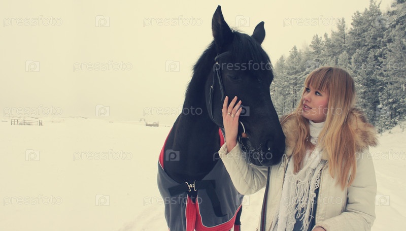Белокурая девушка с лошадью в зимнем лесу