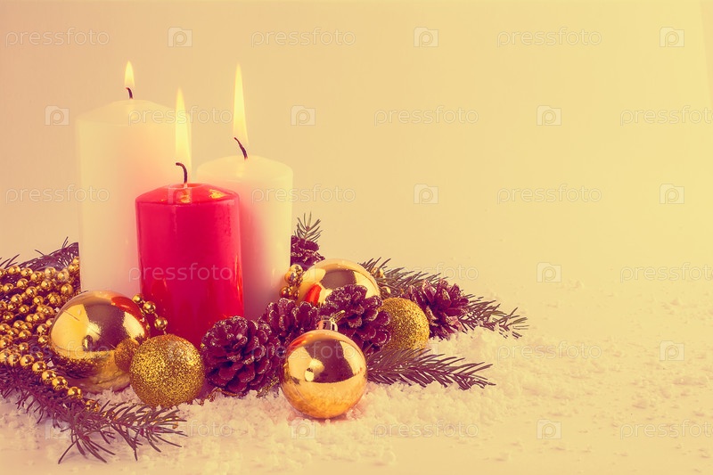 Новогодний фон с горящими свечами и золотистыми шарами, винтажное тонированное