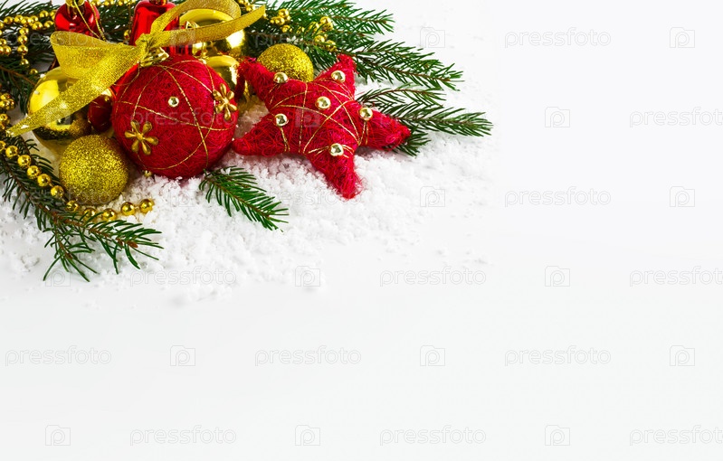 Новогодняя открытка, фон с золотыми бусами и еловыми ветками, ретро.