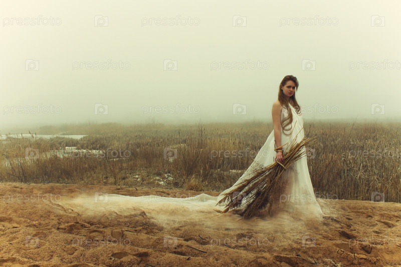 Женщина в белом платье на берегу замерзшего озера