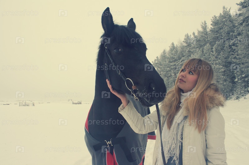 Белокурая девушка с лошадью в зимнем лесу