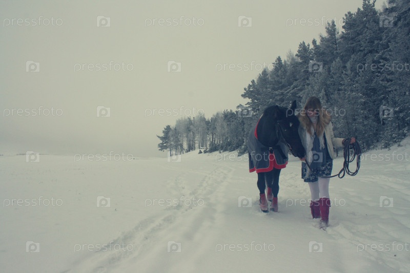 Белокурая девушка с лошадью в зимнем лесу
