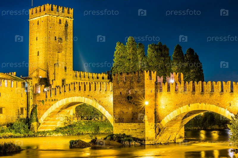 Замок Веккьо в летнюю ночь в Вероне, Италия