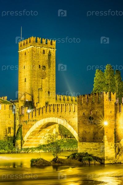 Замок Веккьо в летнюю ночь в Вероне, Италия