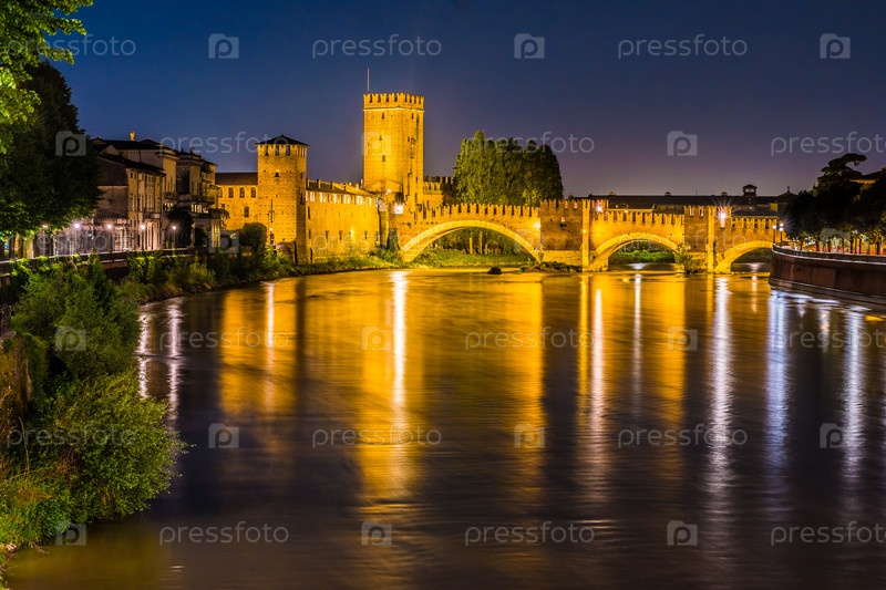 Замок Веккьо в летнюю ночь в Вероне, Италия