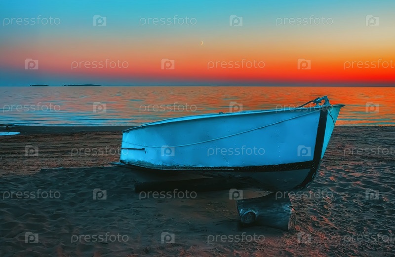 Голубая лодка на пляже на закате