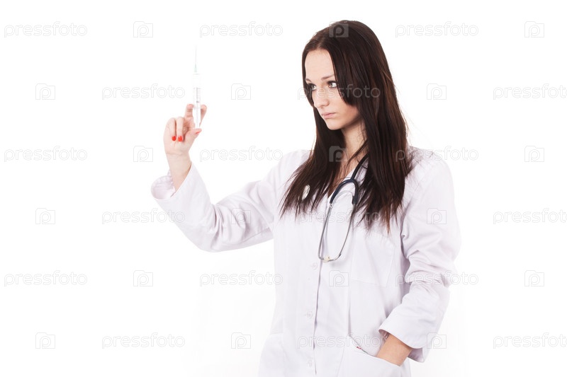 Женщина-врач со стетоскопом и в белом халате держит в руке шприц