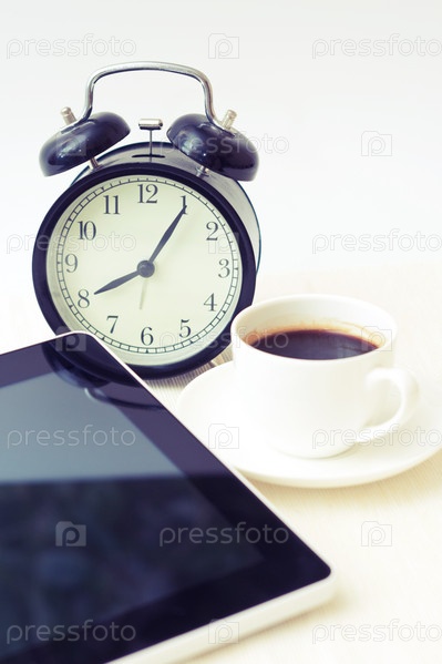 Планшетный компьютер, будильник и кофе на белом фоне