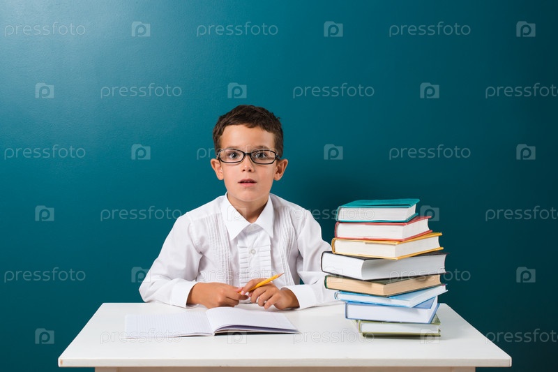 Милый маленький мальчик с книгами на столе