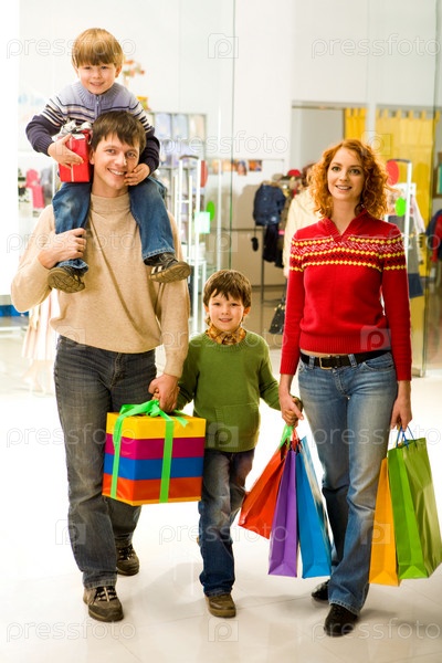 Портрет семьи, идущей по торговому центру после покупки рождественских подарков