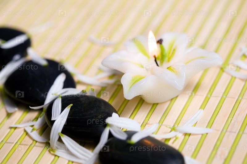 Горящая свеча и черные камни с лепестками