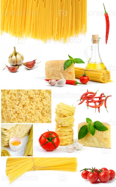 Различные ингредиенты итальянской кухни: макаронные изделия, сыр, помидоры