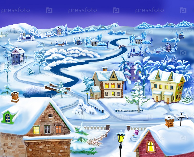 Зимняя ночь в пригороде перед Рождеством