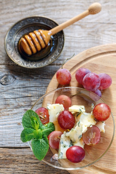 Голубой сыр, розовый виноград, мед и мята
