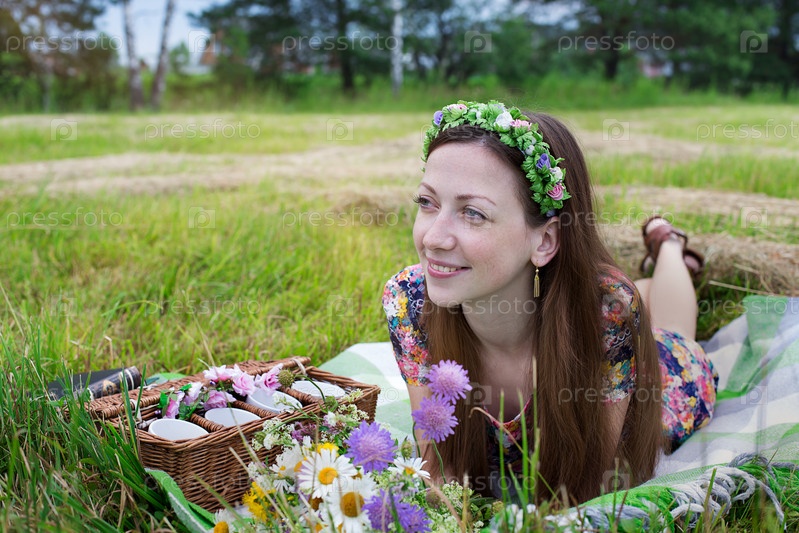 Девушка лежит на лугу