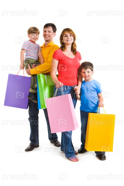 Портрет счастливой семьи, стоящей и держащей в руках сумки, глядя на камеру с улыбкой