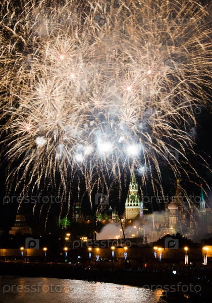 Красивые фейерверки в небе над Кремлем