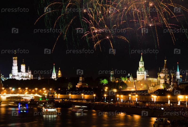Разноцветные фейерверки в небе над Кремлем