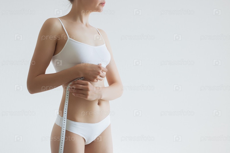 Молодая стройная девушка измеряет свое тело