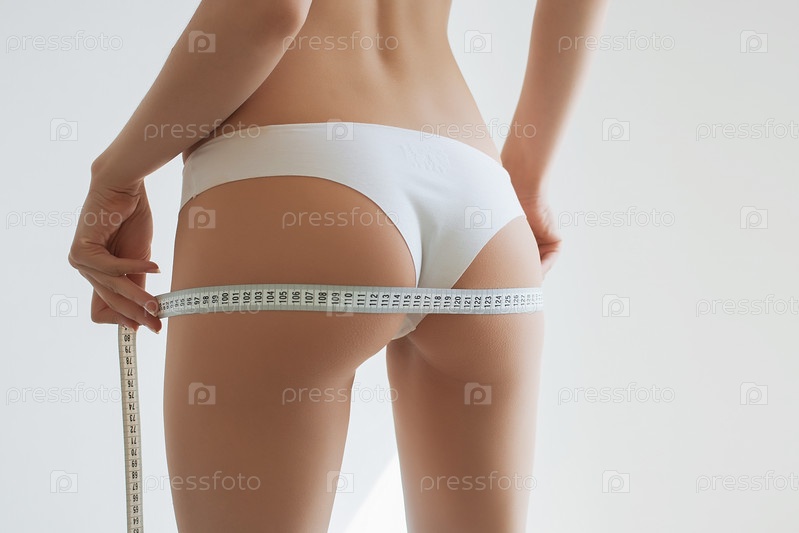 Молодая стройная девушка измеряет свое тело