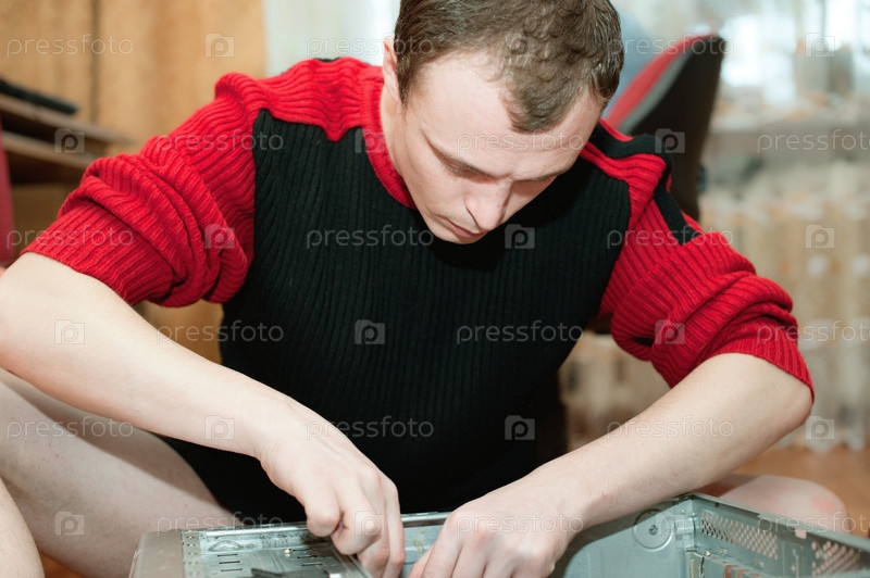 Человек ремонтирует системный блок, сидя на полу