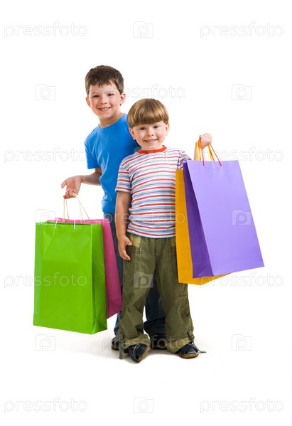 Портрет братьев, держащих сумки с покупками и счастливо смотрящих в камеру