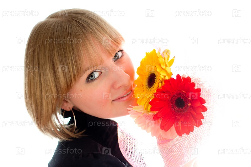 Женщина с герберами, изолированная на белом фоне