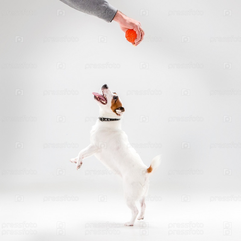 Маленький Джек-Рассел терьер играет с красным мячом