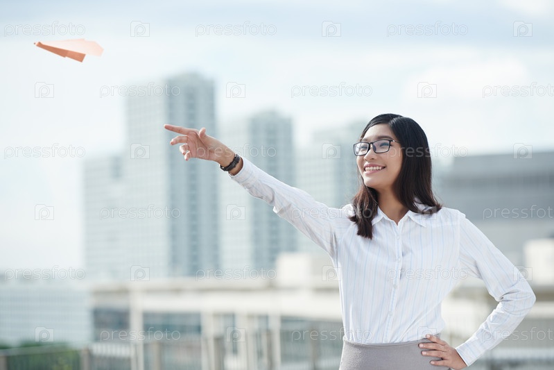 Девушка запускает бумажный самолетик