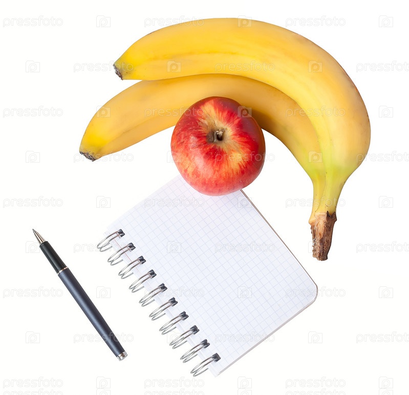 Блокнот, яблоко, бананы и ручка на белом фоне
