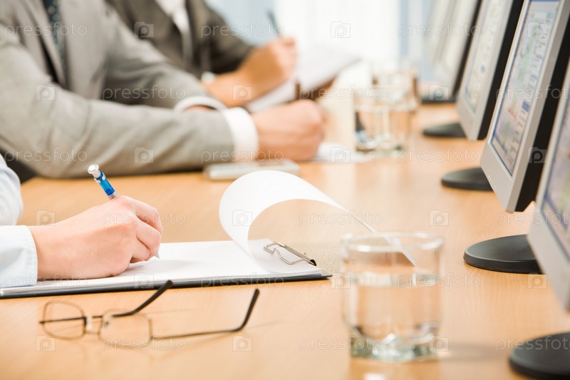 Изображение человеческой руки, держащей ручку и делающей заметки со стаканом воды