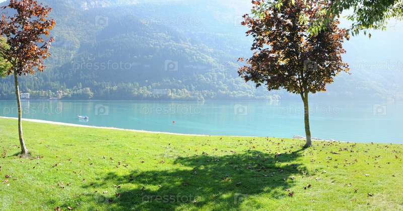 Голубое озеро и зеленая трава