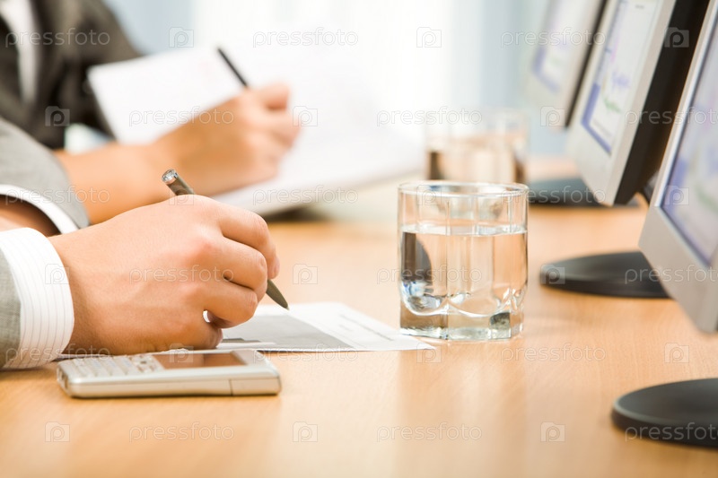 Изображение человеческой руки, держащей ручку и делающей заметки со стаканом воды и мониторами рядом