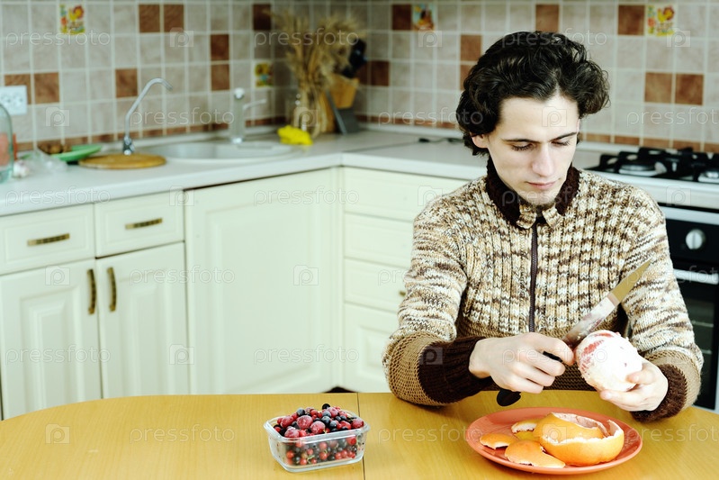Молодой человек ест грейпфрут на кухне